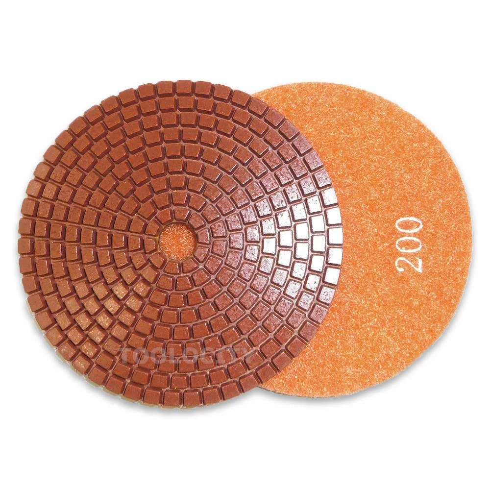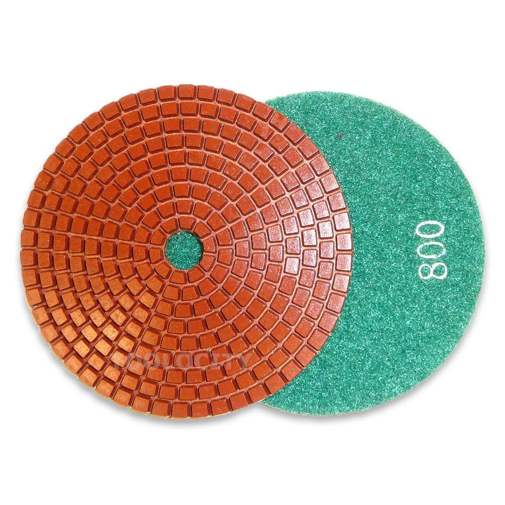 JHX wet metal bond diamond polishing pads are designed to polish hard granite and concrete. They are capable of producing a great finish at an economic price. They are recommended for use on darker colored granite and concrete. Metal bond pads are made by mixing metal powders with resin to provide a tighter bond to diamonds. They are more aggressive and last longer than traditional resin bond pads. A 4 in. semi-rigid back holder is included in this set to use with these diamond polishing pads. The semi-rigid back holder is Velcro faced and made with rubber and brass thread body. Semi-rigid is suitable for polishing both edges and surface. Brass female thread has 5/8-11 thread to fit on most polishers and variable speed grinders.