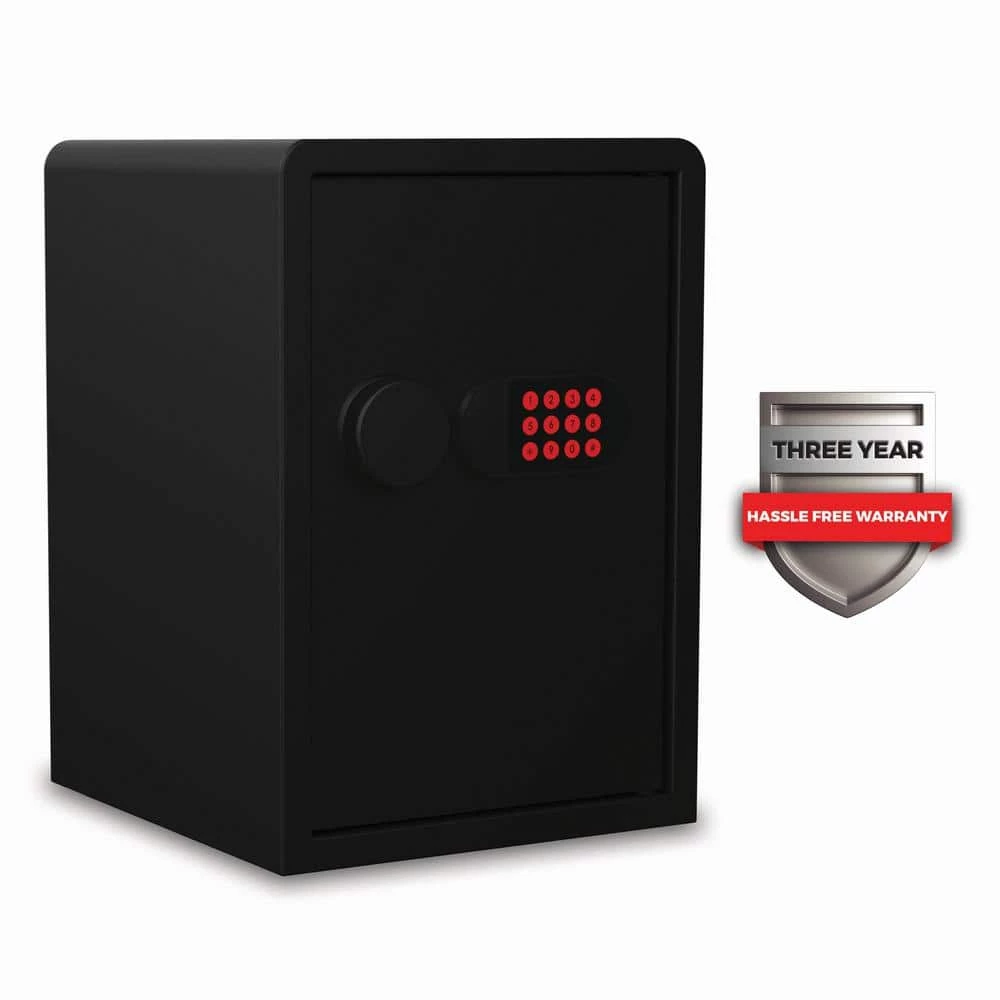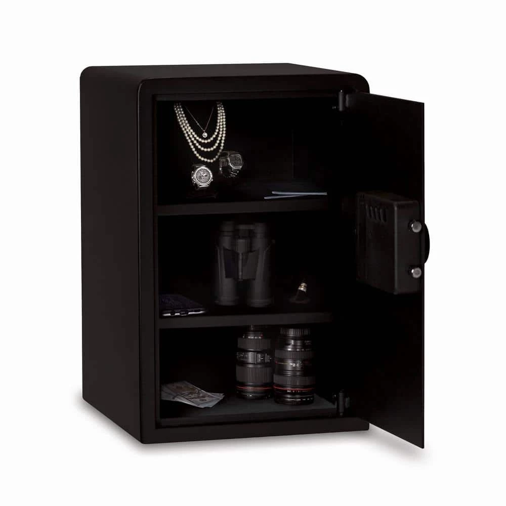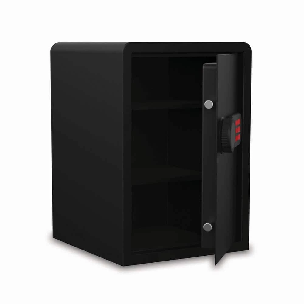 The Sanctuary Home and Office 0.59 cu. ft. Security Vault, SA-PV3L, is a perfect secure storage solution for family homes, job sites, shared apartments, and college dorms. This robust steel vault is reinforced by an illuminated electronic lock that provides fast and simple entry and solid steel locking bolts. This vault has a stylish and sleek design with its rounded edges, Matte black powder coat finish, round ergonomic handle, and concealed hinges. It includes our 3-Year Hassle-Free Warranty that covers defective locks, parts, and paint.