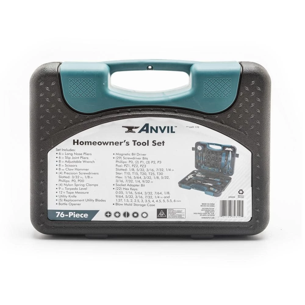 The ANVIL 76-Piece Homeowner’s Tool Set is the perfect set for little jobs around the house. All Tools come enclosed in a bi-fold, blow molded case for easy storage and carrying to a job. The dipped grips on the pliers and wrench provide comfort and control.