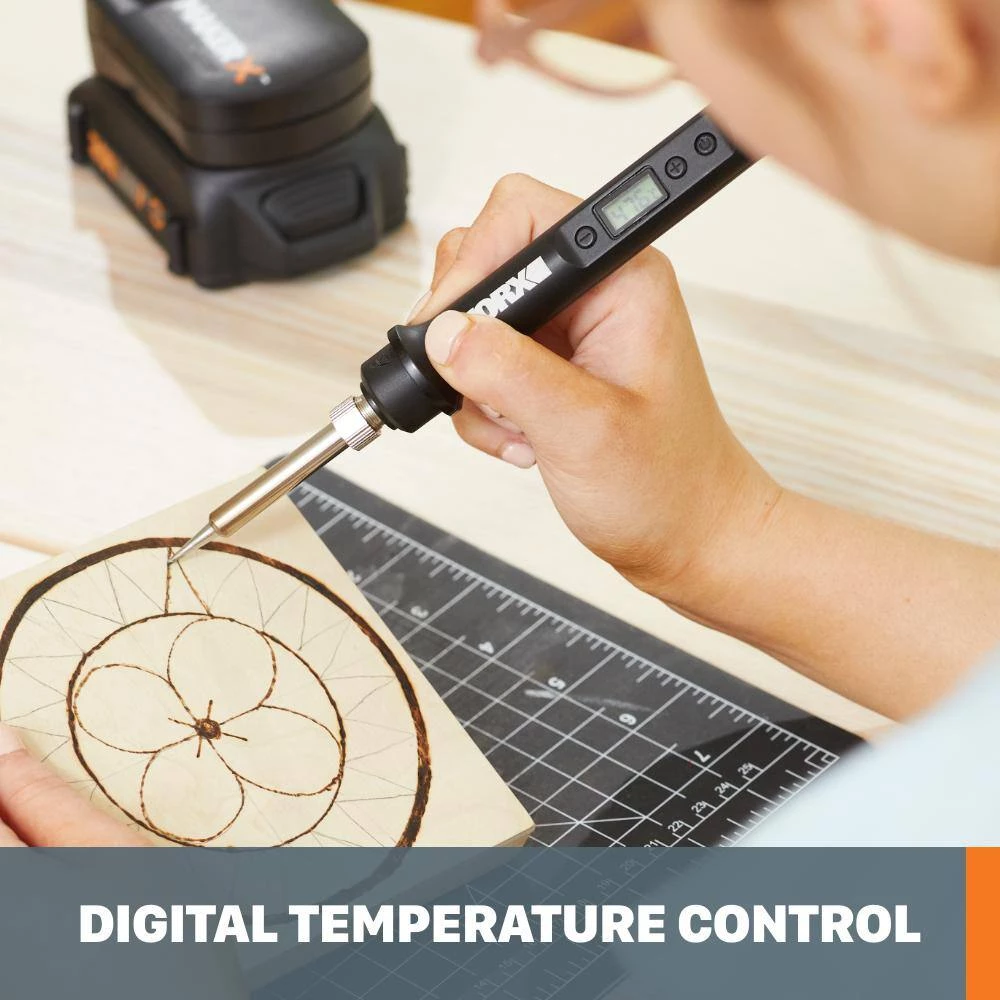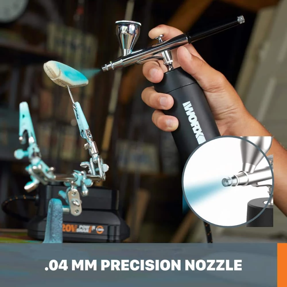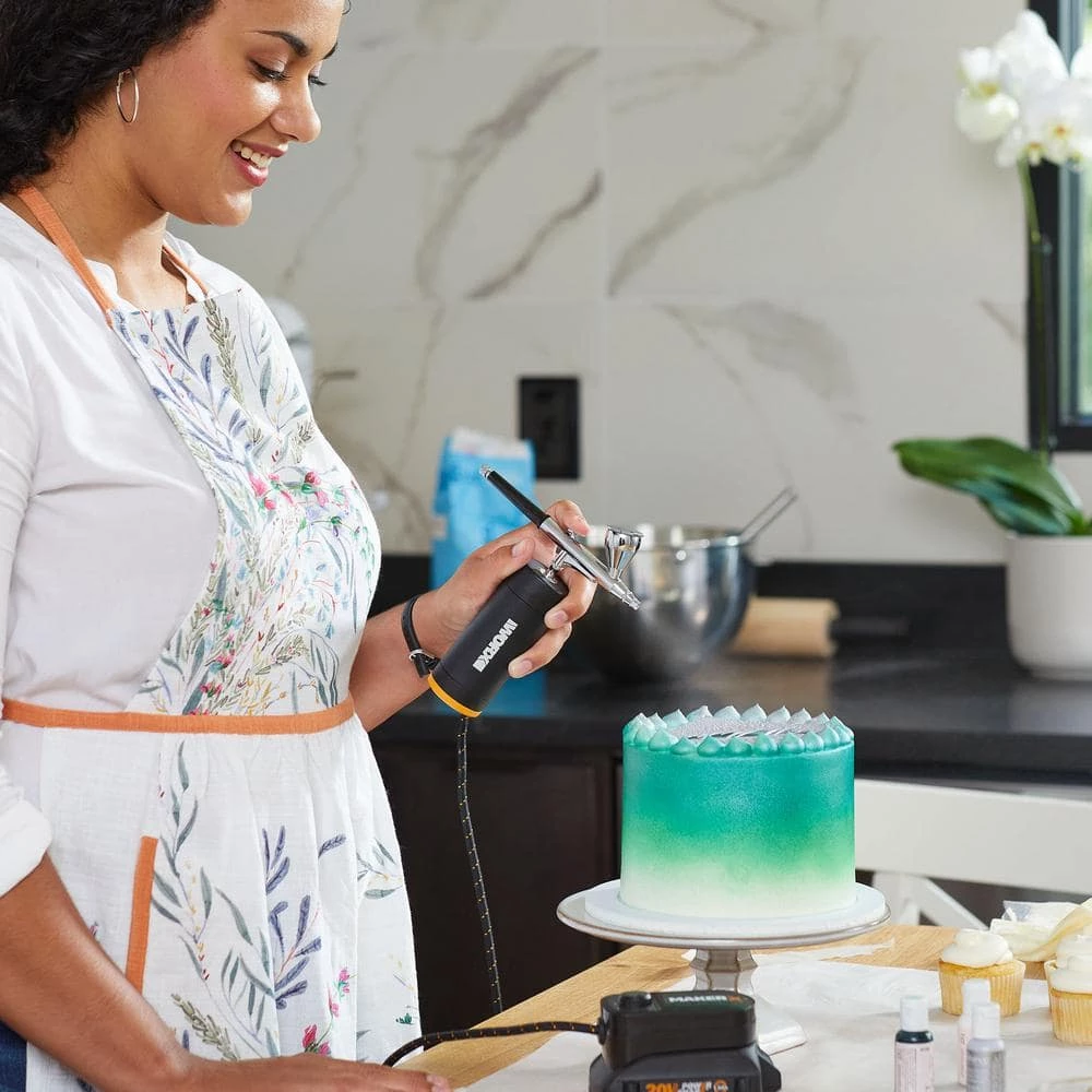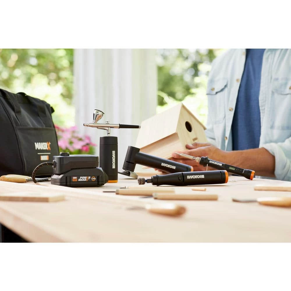 Small by design, still packed with power. The Worx MAKERX Rotary Tool with Brushless Motor fits nicely in your hand. And without an onboard battery pack, it’s lighter, so you can work longer without feeling the fatigue in your arms or shoulders. Yet, with a brushless motor you still get more than enough power to engrave and etch, grind and sand, cut, polish, and clean. And it’s fitted with the common collet size of 1/8″. It can work with all standard collet sizes, so it accepts the bits and accessories of all the major brands. The Worx MAKERX Angle Grinder with Brushless Motor was specifically designed to be slim and easy to grip yet with more than enough power to cut thin sheet goods and aggressively carve out complex shapes and contours. This disc grinder accepts all 1.5″ wheels with ¼” butterfly-style arbor, and 2″ wheels with a 3/8″ arbor, even wheels from other brands. The Worx MAKERX Air Brush is the only 20V portable air brush on the market. There’s no need for an air compressor, it’s just your MAKERX Air Brush and the Hub going where you go. With its 0.4 mm precision nozzle, it excels at fine, detailed jobs, like culinary art pieces and tiny crafts of all kinds. The Worx MAKERX Wood & Metal Crafter has a slim design so you can hold it like a pen and do much finer work. Ideal for marking wooden signs, embellishing leather goods, branding wooden boxes, making bracelets out of old glass or stones, customizing leather belts, jewelry making and metal crafting.