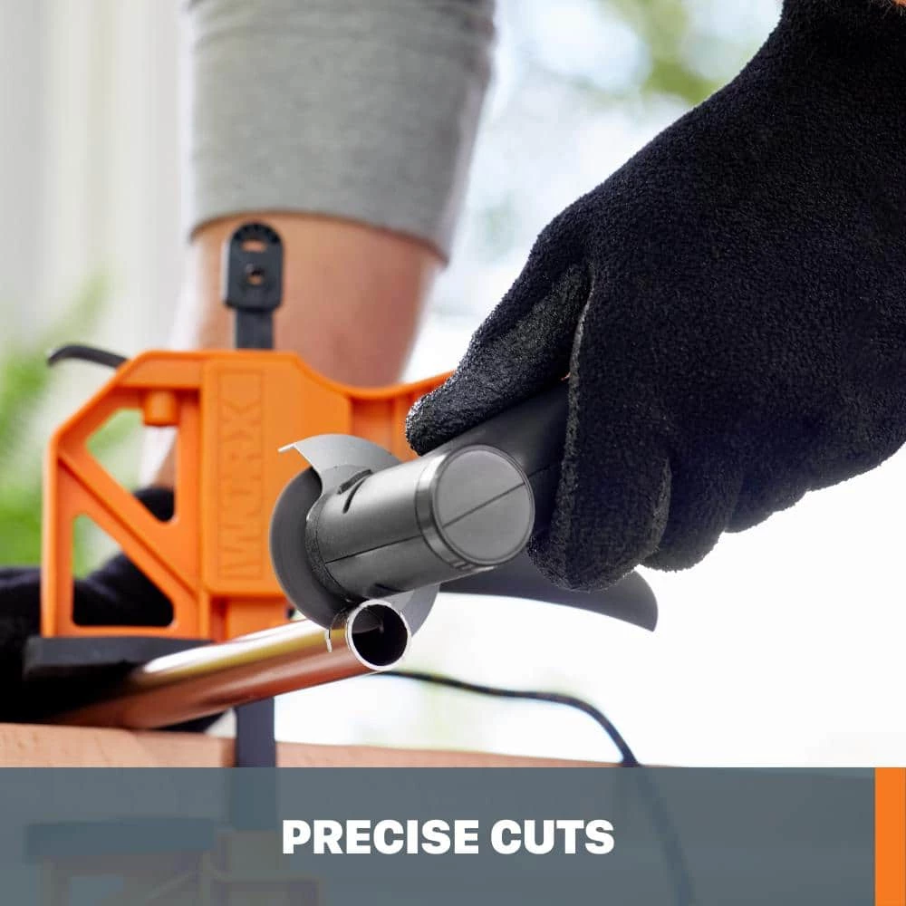 Small by design and packed with power. The Worx MAKERX Rotary Tool with Brushless Motor fits nicely in your hand, and without an onboard battery pack, it’s lighter, so you can work longer without feeling the fatigue in your arms or shoulders. With a brushless motor you still get more than enough power to engrave and etch, grind and sand, cut, polish, and clean. The variable speed control lets you pick just the right amount of juice for the job, which you can control right from the Hub. So for different materials and different types of work, you can find the speed that works for you. And it’s fitted with the common collet size of 1/8″. It can work with all standard collet sizes, so it accepts the bits and accessories of all the major brands. Get the MAKERX Rotary Tool and start engraving glass, wood, and metal. Cut off protruding bolts, grind rust off iron rails before painting, sand children’s toys, or polish a brass nameplate while it’s mounted. The Worx MAKERX Angle Grinder with Brushless Motor was specifically designed to be slim and easy to grip yet with more than enough power to cut thin sheet goods and aggressively carve out complex shapes and contours. Cut pipes for wind chimes, make a wooden card holder, refurbish the glass on those foggy headlights, cut guttering or siding in place, or shape copper sheets for ornamental pieces. This disc grinder accepts all 1.5″ wheels with ¼” butterfly-style arbor, and 2″ wheels with a 3/8″ arbor, even wheels from other brands.
