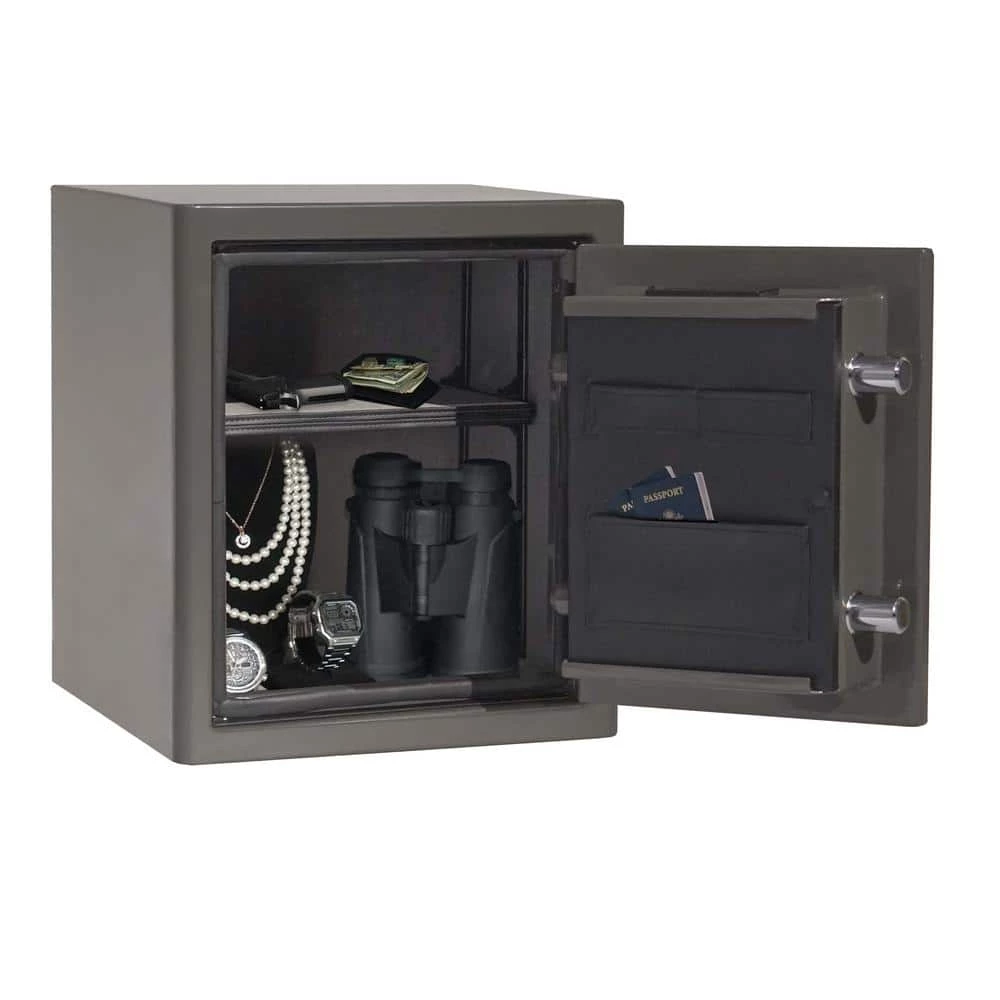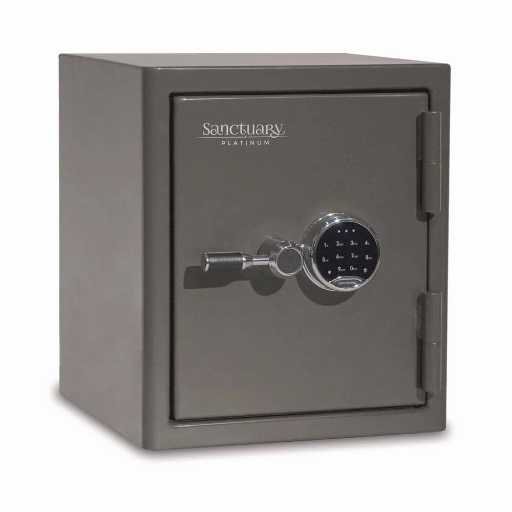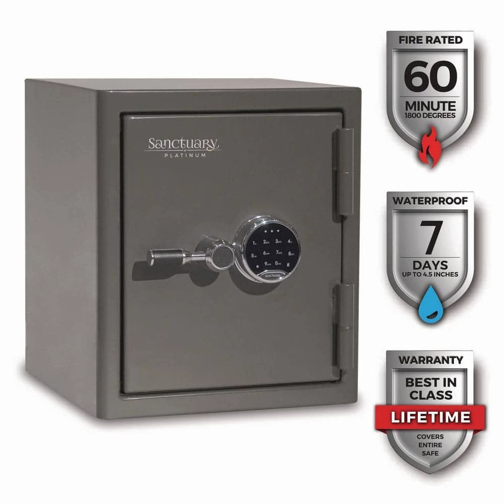 The Sanctuary Platinum – Medium fire and waterproof home and office safe is secure, easy to use, and built to fit your important documents and valuables. You can rely on our Sanctuary Platinum home and office safe to protect your valuables from fire, water and smoke with our proprietary triple seal, fire protection of 60 minutes up to 1750°F, and water protection for up to 7 days up to 8.5 inches feet of standing water, all of which are 3rd party tested to ensure accuracy. The Sanctuary Platinum safe is equipped with a fully programmable digital lock with illuminated numeric touch pad and a theft alarm that triggers an alarm during unauthorized entry. The security features include a rugged steel construction, two 1.25″ active steel bolts and two 1.25″ dead bolts, 2 back-up keys, a waterproof bolt-down kit and two pre-drilled holes, allowing you to anchor the safe at your desired location. The key features include a carpeted interior for surface protection, a black leather door organizer, and one fully wrapped and adjustable carpeted shelf that offers a functional space division for storing valuables. This safe is approved by the California Department of Justice and includes our BEST lifetime warranty that covers the safe against theft, fire, natural flood, locks, parts, and paint.