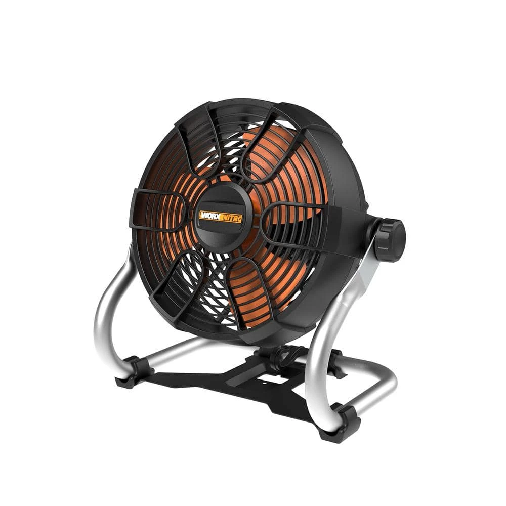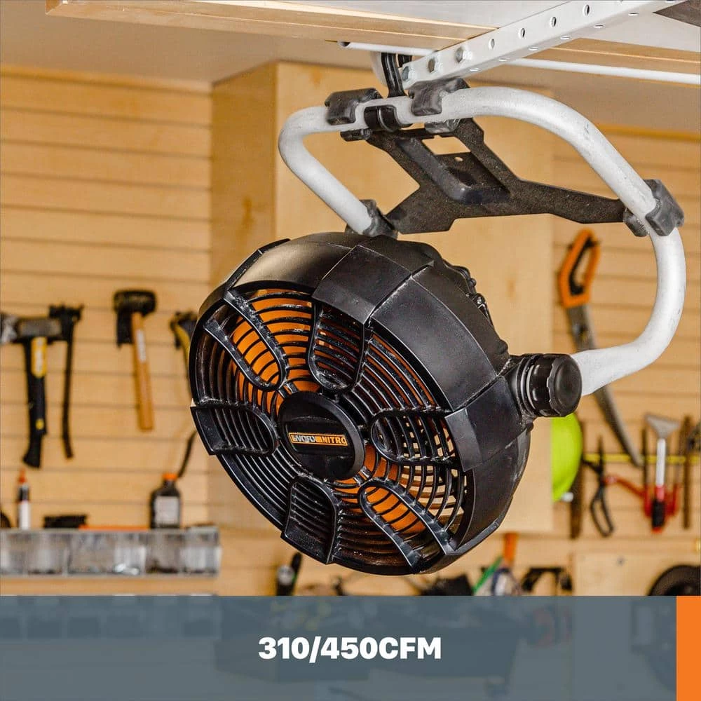 Every workspace needs a fan. Get one that you can take from job to job, or move around the workshop. The Worx Nitro 20-Volt Power Share Cordless Work Fan with Ready Charge is perfectly designed to meet that requirement. Small and lightweight enough to be portable, powerful enough to cool down or ventilate a room. Use it anywhere on battery power for up to 6-hours on Low speed, or 2-hours on High, with a standard 2.0Ah battery. Or take advantage of its Ready Charge functionality and plug it in and charge the battery while the fan is still in use. Low speed operates at 0-1500 RPM/310 CFM, High at 2500 RPM/450CFM. To put it in perspective, that’s as much high-volume air output as a heavy-duty leaf blower. Yet this fan’s blade diameter is only 9 in, and it weighs just 5 lbs., so it’s easy to transport and store. The head rotates 360° so you can blow or ventilate in whichever direction you need to. The convenient hanging hook means you can place it up high and hang it from a shelf, beam, pipe, or pretty much anything. It also has mount holes on the back so you can install it on the wall for a more permanent placement. This cordless work fan is part of the Worx Nitro Series of battery-powered tools, engineered to deliver more performance and run time than other battery-operated tools on the market.