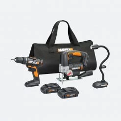 The Worx 20V Power Share Cordless Drill, Jigsaw & Flex Light Combo Kit comes with a fully featured cordless drill/driver to take on every common drilling application, a powerful but easy to use cordless jigsaw, and an indispensable flex light to illuminate any workspace. The drill/driver cranks out 265 in-lbs. of torque with 15 different clutch positions. That means you’ll find the perfect setting for whatever unique combination of screw, bit, and project material you’re using. And the 2-speed gearbox and control trigger let you go from 0-1450 RPM, depending on the needs of the job. The cordless jigsaw has plenty of power to get the job done. With a no-load speed of 2600 RPM, a variable speed trigger for precise control, and a highly efficient orbital function, you’ll be slicing through wood, aluminum, PVC and more with ease. The flexible LED light was built to illuminate hard-to-reach places. It’s durable, has a narrow head, and can hang from almost anything-perfect for tight spaces like under the sink, under the hood, or for working in closets and cabinets. This combo kit comes with 2 Power Share batteries that are interchangeable with all three of these tools, plus every other tool on the Power Share platform-every saw and sander, blower and lawnmower, trimmer and multi-tool. It’s the cost-effective way to build a tool, outdoor power and lifestyle product collection, because you don’t have to buy a new battery every time you buy a new Worx Power Share tool.