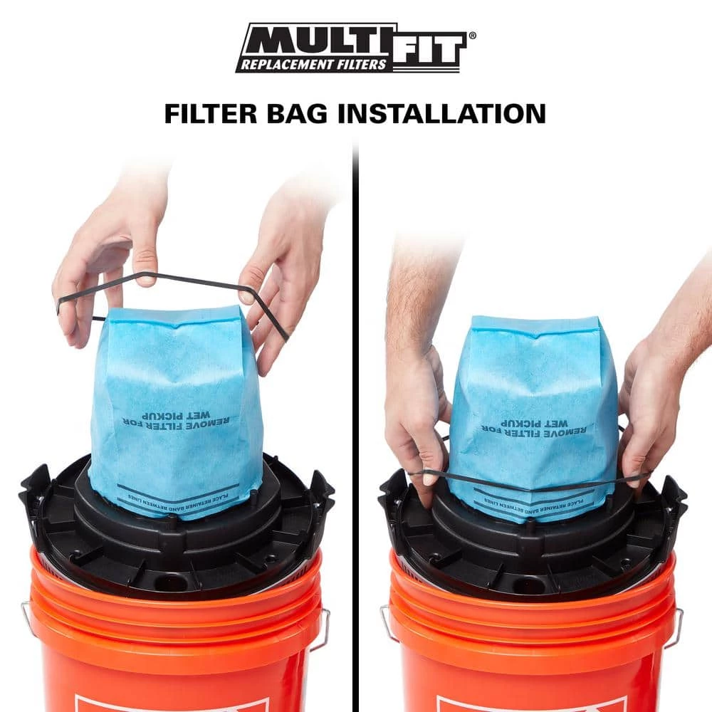 Always be ready for your next cleanup mess with this 3 pack of MULTI FIT replacement bag filters designed to fit Husky, Bucket Head or Stinger wet/dry vacs. These high quality filter bags are easy to use and are made for standard dry pickup applications such as general dirt and dust. Remove shop vacuum replacement bags for wet pickup. Using these MULTI FIT filter bags increases the optimal vacuum performance and prolongs the life of the vac by protecting the motor from harmful dust and debris. Installation and removal is simple so the job can get done quickly and efficiently. To install, slide the MULTI FIT replacement bag filter over the shop vac filter cage and secure with the included mounting band – no tools required. General household pickups just got easier.