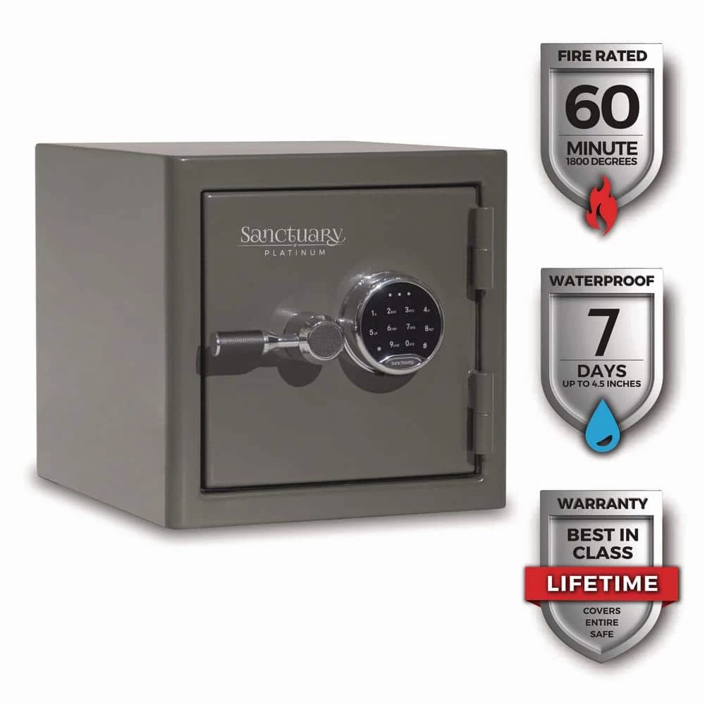 The Sanctuary Platinum – Small fire and waterproof home and office safe is secure, easy to use, and built to fit your important documents and valuables. You can rely on our Sanctuary Platinum home and office safe to protect your valuables from fire, water and smoke with our proprietary triple seal, fire protection of 60 minutes up to 1750°F, and water protection for up to 7 days up to 6 inches of standing water, all of which are 3rd party tested to ensure accuracy. The Sanctuary Platinum safe is equipped with a fully programmable digital lock with illuminated numeric touch pad and a theft alarm that triggers an alarm during unauthorized entry. The security features include a rugged steel construction, two 1.25″ active steel bolts and one 1.25″ dead bolts, 2 back-up keys, a waterproof bolt-down kit and two pre-drilled holes, allowing you to anchor the safe at your desired location. The key features include a carpeted interior for surface protection, a black leather door organizer, and one fully wrapped and adjustable carpeted shelf that offers a functional space division for storing valuables. This safe is approved by the California Department of Justice and includes our BEST lifetime warranty that covers the safe against theft, fire, natural flood, locks, parts, and paint.