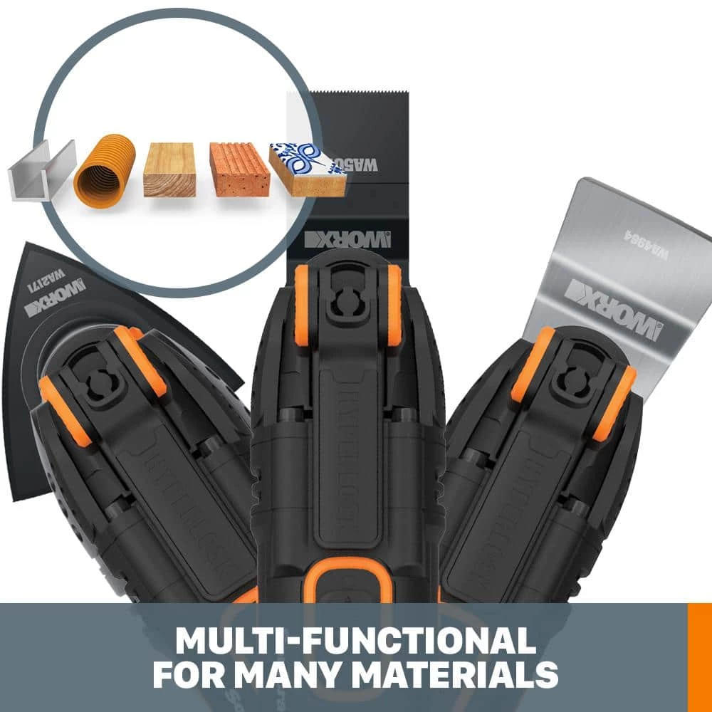 Cut, saw, and sand with the 21,000 oscillations/min that the Worx 3 Amp Oscillating Multi-tool with 70 Accessories provides. That’s enough power to saw through a nail, but precise enough for detail work. The Universal Fit gives you the ability to use almost any sander or blade in this tool, so you can tackle any project. Hyperlock will keep it locked into place, so there’s no wasted motion-all the power from the motor goes into your final product. Smaller is better. This tool is just over 3 lbs. and fits into places larger tools could never go, which only increases its usefulness. With exponentially more power than hand tools, it’s the best of both worlds. So whether you need to saw, sand, scrape, cut, rasp, or remove grout, this is the tool for the job. Safer than a saw – though powerful, this tool moves in tiny back-and-forth motions, like a medical saw that’s used to cut off casts. It’s capable of tremendous power, but delicate enough for precise jobs. There’s no kickback and anyone can use it.